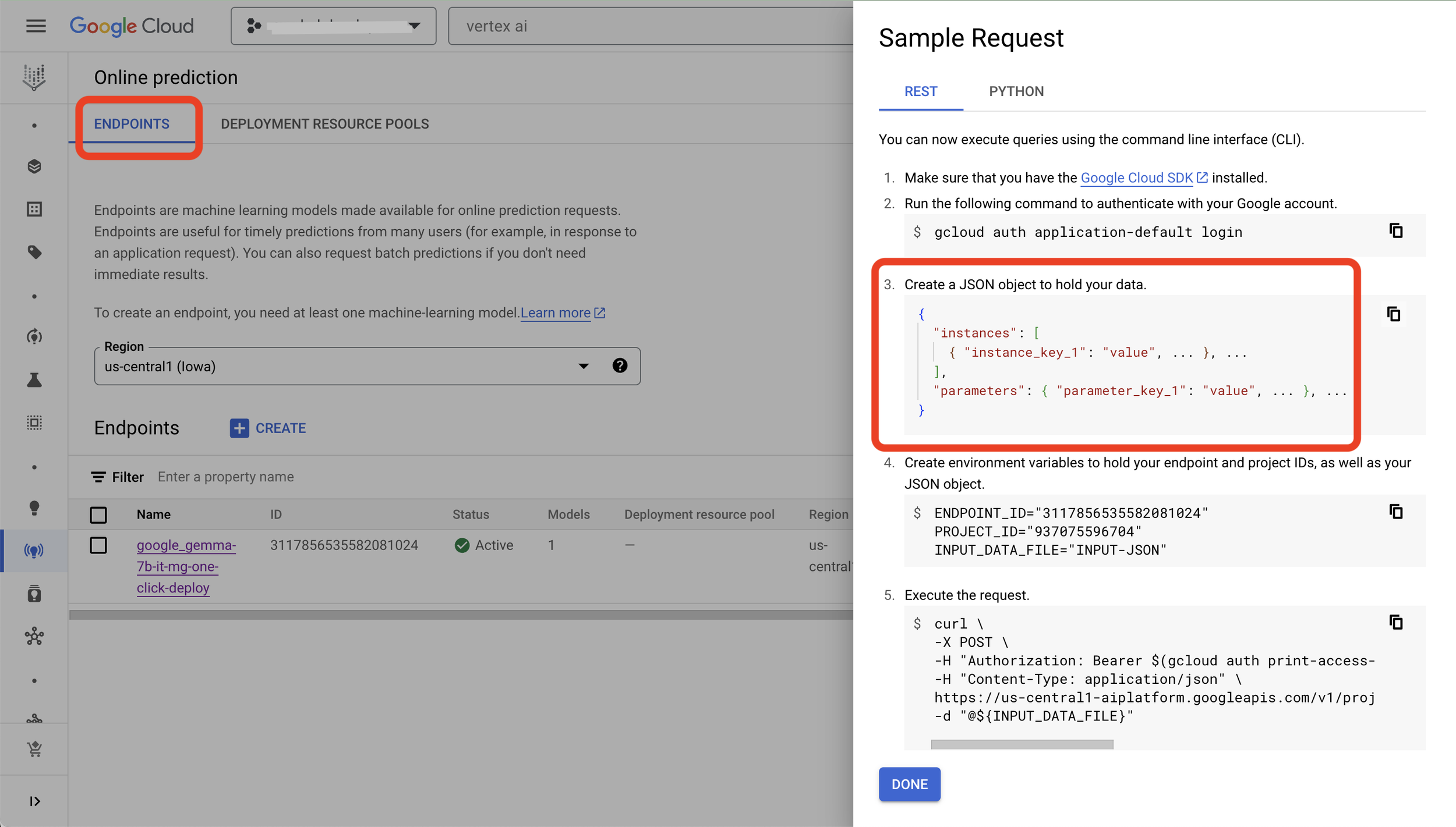 Step 4: Once the endpoint is deployed you can see it in “Online Predictions” and click on “Sample Request” to see how to frame your request to call the endpoint.