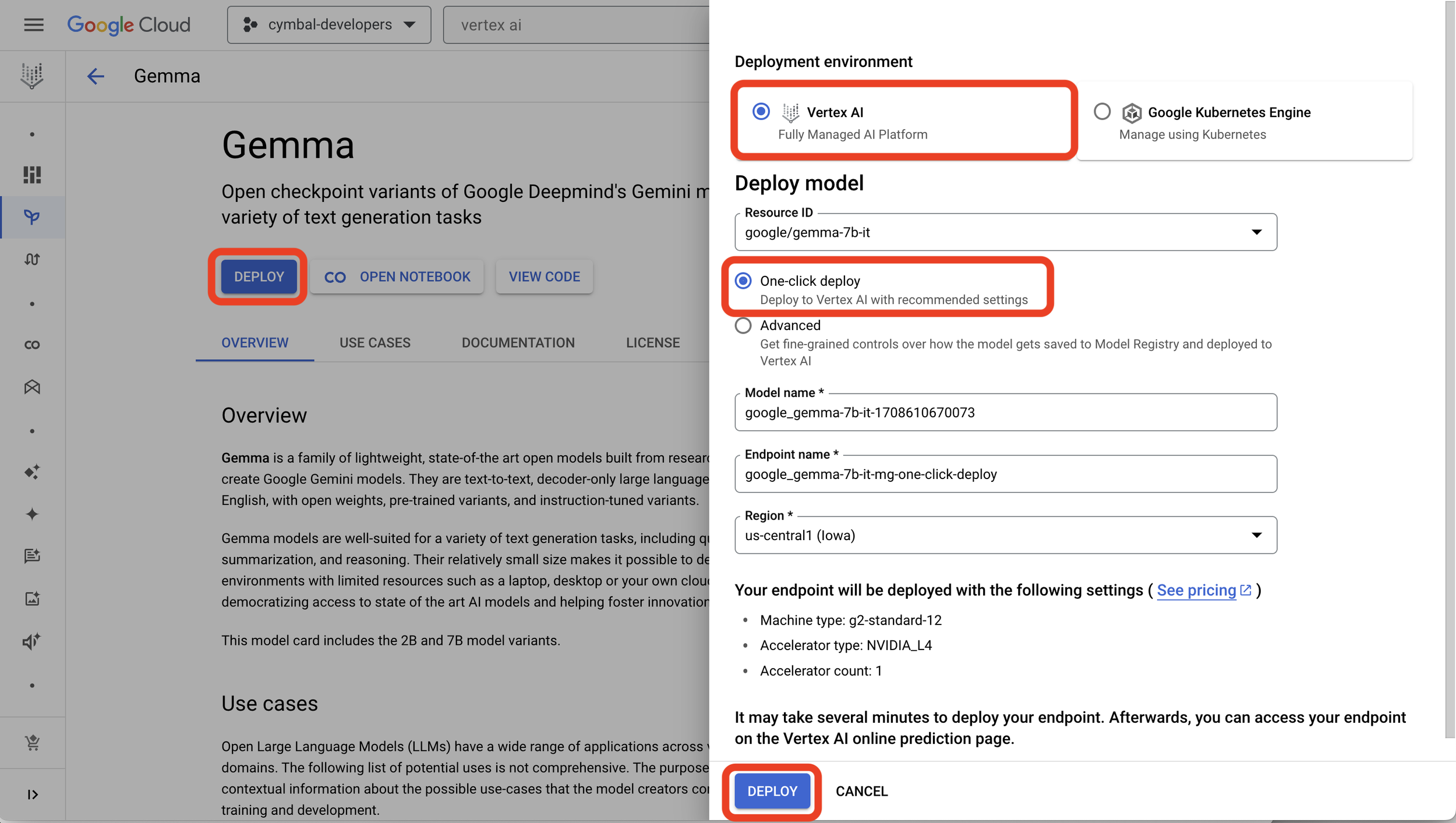 Step 3: You can deploy Gemma in your own project in Google Cloud using Vertex AI or Google Kubernetes Engine. I selected Vertex AI here and you can select one-click deploy to straightaway deploy it in your cloud environment. It takes a few mins to see the deployed endpoint.
